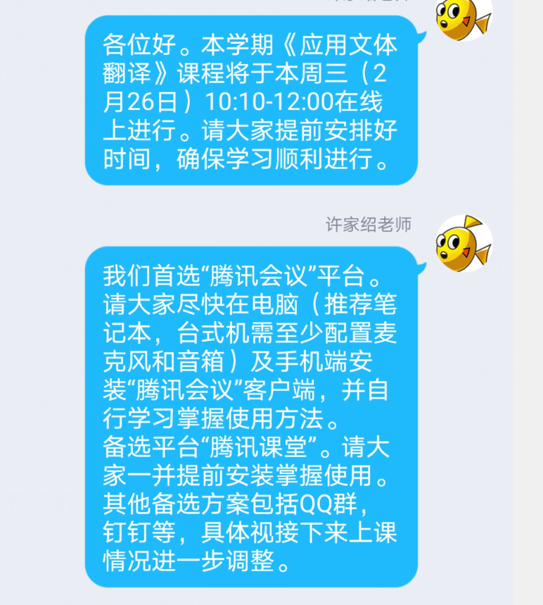 第三,创新在线教学方式。任课教师积极响应,准备了QQ群课堂、腾讯会议、钉钉直播等多种在线授课预案,建立相应课程的教学支持辅助群,根据课程特点和专业培养特色,因“课”施教,主动创新授课方式,确保教学内容不缩水,教学质量不降低。翻译硕士笔译实践课程做到课前布置任务,课上讨论答疑;口译课程多渠道并用,采用直播平台进行现场播放音频、现场口译,同时提交口译音频到课程QQ群,师生围绕录音进行在线讨论点评,大大缓解了直播平台网络延迟的问题。
